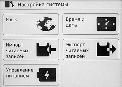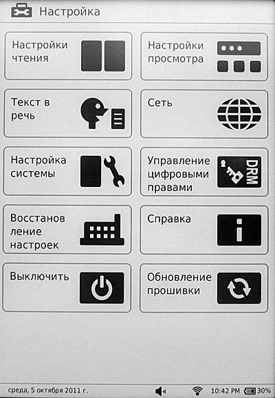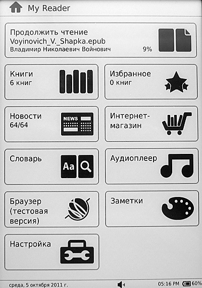 Главная страница построена по стандартному принципу: крупные кнопки основных приложений: читаемая книга, книги (библиотека), новости, избранное, интернет-магазин, словарь, аудиоплеер, браузер, заметки и настройка.