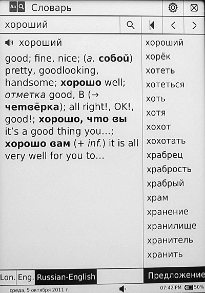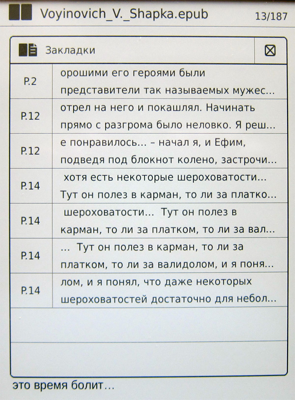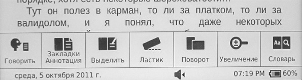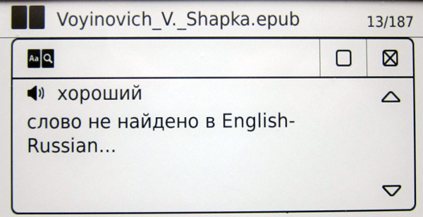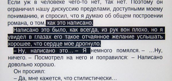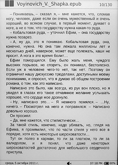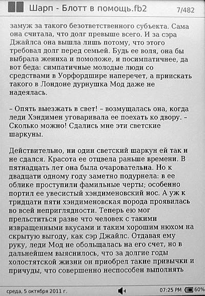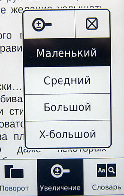 Второй момент, который мне не нравится именно в данном ридере - это очень странная технология обновления страницы. Впрочем, само перелистывание производится совершенно нормально и тут нет жутких треков, как в "Айчиталке". Однако, что заметно раздражает, так это манера ридера обновлять различные страницы в самый неожиданный момент, когда ты с ней ничего не делаешь. Особенно часто это проявляется при работе со всякими меню - открываешь меню, читаешь пункты меню, вдруг страница полностью перезагружается. Неприятно.