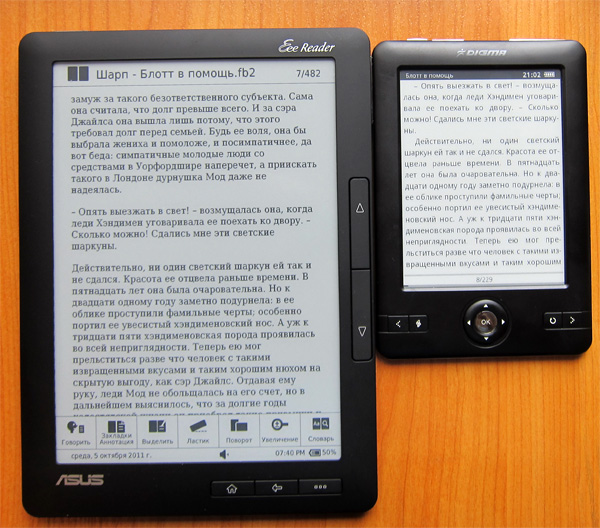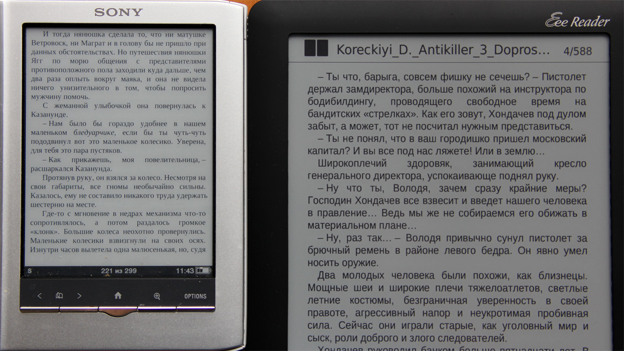 Вот, сравните экран этого ридера и Sony Reader PRS-350 (кликабельно).
