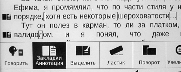Закладки и Аннотация -  поставить закладку на страницу и при необходимости написать аннотацию. Закладки ставятся на конкретные места в тексте методом ненаучного тыка пальцем.