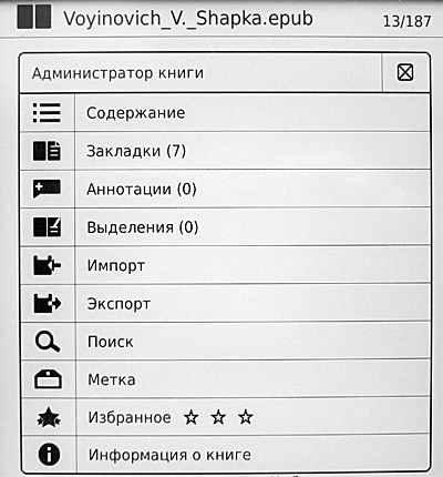 В общем, FB2 совершенно разочаровал. Меню опций тут такое же, как в остальных форматах, так что меню подробно рассмотрим на формате EPUB, благо его ридер все-таки показывает нормально.