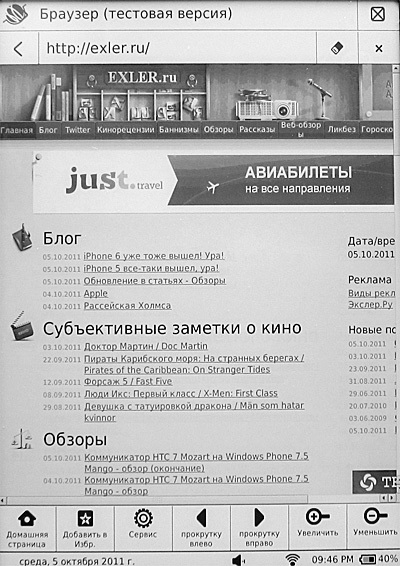 Я никогда не понимал, на черта в ридере браузер. Реально пользоваться этим - практически невозможно, разве что кроме очень специализированных сайтов.