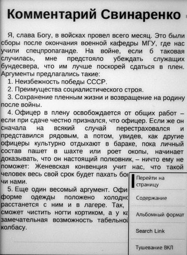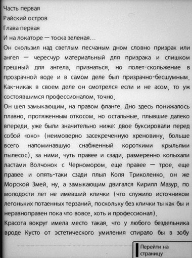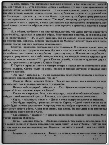 Формат FB2 вроде как не поддерживается, однако в папке с незазипованными книжками этого формата ридер их увидел и даже что-то смог открыть. Впрочем, это, скорее, просто заготовка на будущее, потому что форматирование заголовков и разделов не отрабатывается, а сервиса нет никакого, кроме перехода на страницу и изменения кегля шрифта четырех размеров.