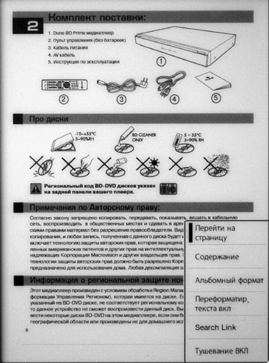 Из возможностей: переход на страницу, вызов оглавления, переключение в альбомный режим (также это можно сделать пробелом), переход по сноскам и какое-то загадочное "тушевание", суть которого я так и не выяснил.