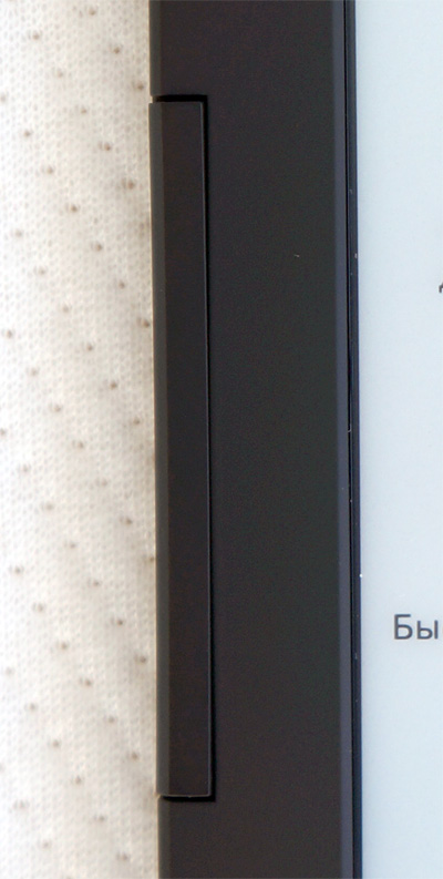 Кроме того, не понравилось, что у дисплея, который здесь сенсорный, слишком высокие бортики, что явно мешает нажимать пиктограммы, расположенные в углах экрана. У того же  Sony PRS-T1 на бортиках вокруг дисплея сделаны заметные скосы, что делает удобным нажатия по углам и вдоль бортиков.