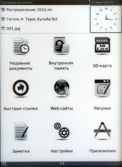 Экран загруженного ридера выглядит достаточно традиционно. Сверху - список последних открытых файлов и виджет с часами. Под ними - крупные пиктограммы основных приложений.