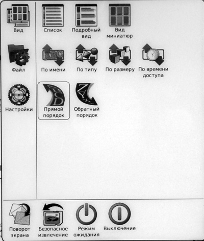 Сразу вызываем меню по длинному нажатию - а чего тянуть? Появляется вот такое вполне вменяемое меню, знакомое нам (по крайней мере, мне) по прошлым моделям Onyx.