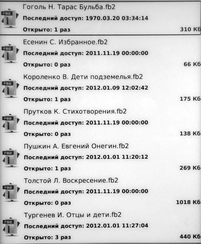 2. В списке прочитанная книга никак не отмечается. Даже вручную отметить нельзя. В отличие от PocketBook 301, который не только даёт возможность ставить такие отметки вручную, но и умеет автоматически помечать в списке книги, которые уже открывались, и книги, которые дочитаны до конца. Так что предыдущий недостаток становится достоинством - очень легко понять, открывал книгу или нет: если в списке имя файла - не открывал, если название книги - открывал 😄