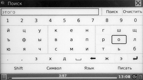 Поиск - появляется экранная клавиатура, в которой можно ввести подстроку для поиска. С сенсорным экраном это все превращается в очень простую процедуру.