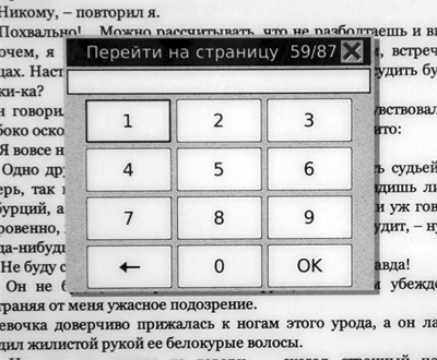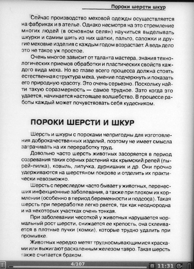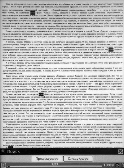 Ну, вроде и все из возможностей работы с текстом FB2. Надо сказать, что возможности - очень и очень неплохие, отрабатывает их ридер безо всяких проблем. Листать страницы можно как кнопками, так и прикосновением пальца к соответствующей части дисплея (наиболее удобный способ).