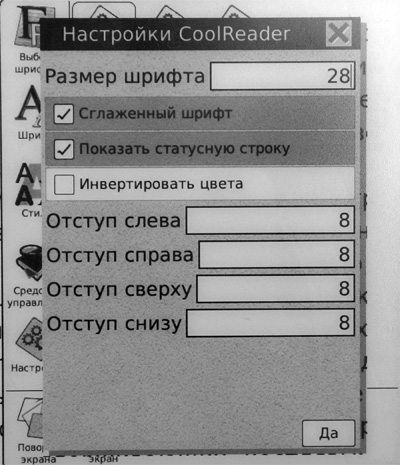 10. От FBReader'а я сразу отказался, потому что тут он не показывает текущую страницу и общее число страниц книги. А CoolReader... Я не понимаю, какое отношение ЭТО имеет к настоящему CoolReader'у. У меня эта программа стоит на андроидном телефоне, я хорошо знаю её возможности. Например, деление экрана на зоны с возможностью гибкой настройки реакции на касание и длительное нажатие в этих зонах. Ну и где все эти настройки на ридере? Я не могу, например, включить возможность по длительному нажатию листать сразу на 10 страниц. Плюс достаточно частые глюки с реакцией на касания: касаюсь экрана у правой кнопки, а ридер вдруг листает назад, а не вперёд. Долго нажимаю на экран, а вместо показа меню перелистывается страница.