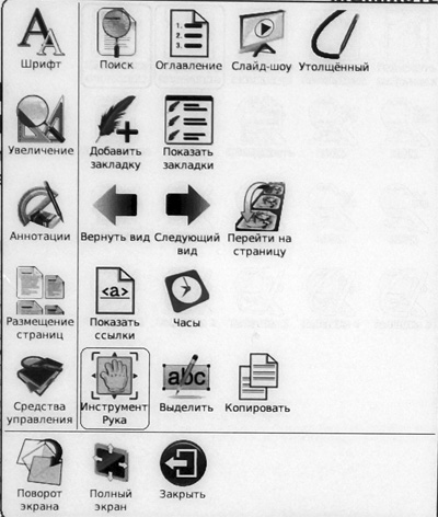 Важный пункт "Средства управления" - поиск, переход к оглавлению, добавление и просмотр закладок, переход на страницу.