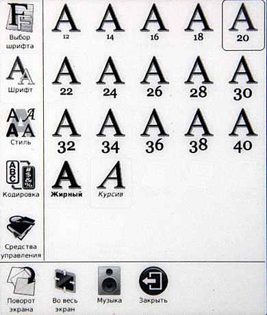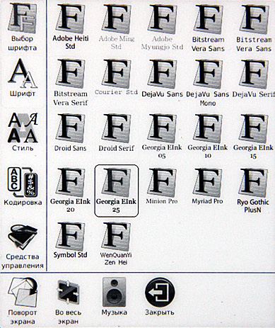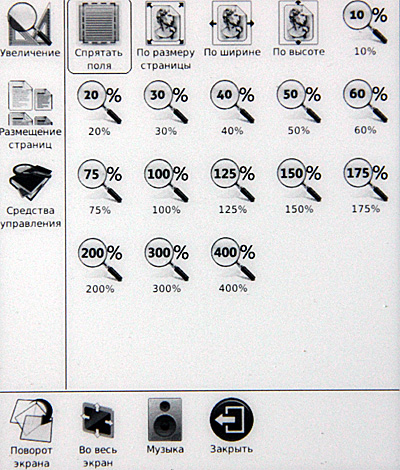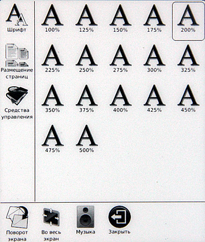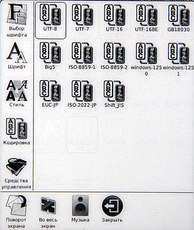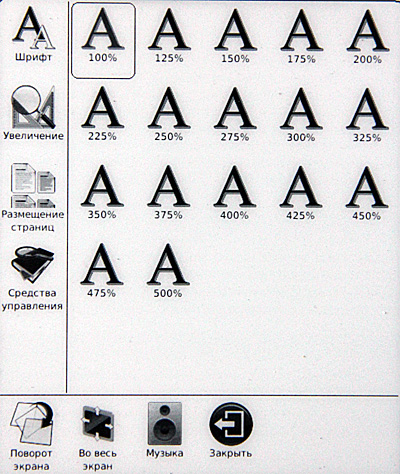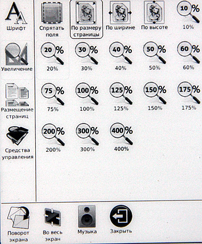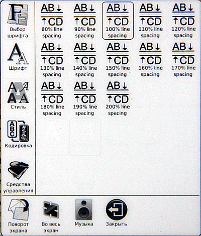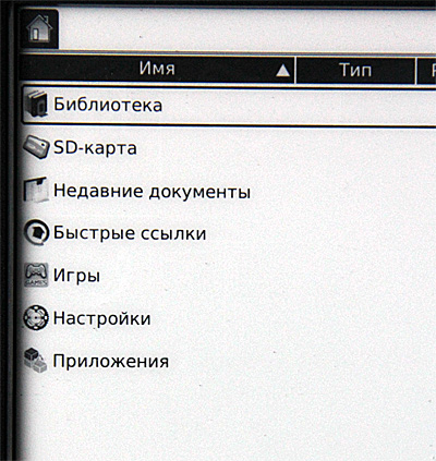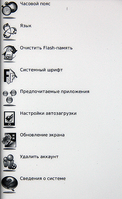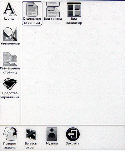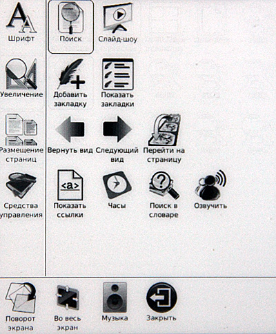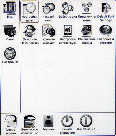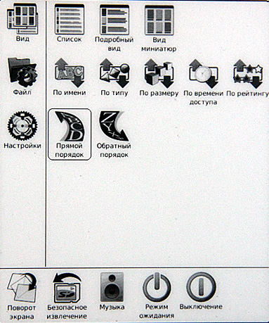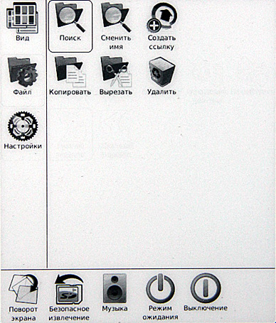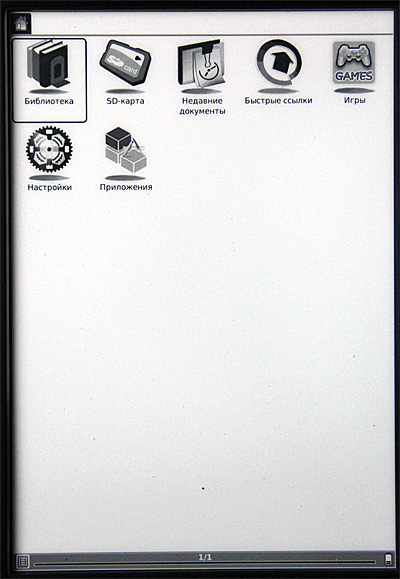 Включаем. Сразу видно, что с софтом решили не напрягаться: взяли прошивку от шестидюймового ридера, а на таком здоровенном экране эти семь пиктограммок выглядят откровенными сиротками.