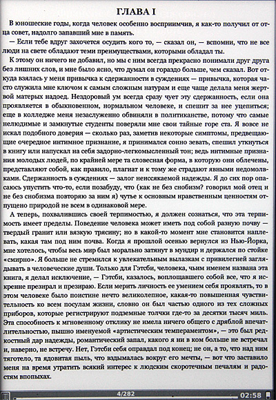 Что тут сказать по чтению FB2? В принципе все вполне неплохо. Единственный заметный минус - отсутствует настройка полей отступа, а по умолчанию поля слишком маленькие - читать некомфортно, особенно учитывая то, что дисплей заметно утоплен в корпусе (на пару миллиметров).