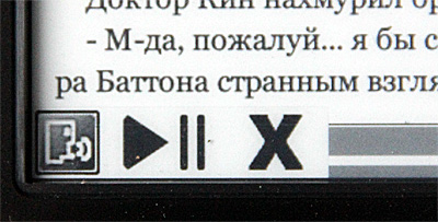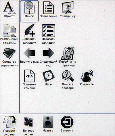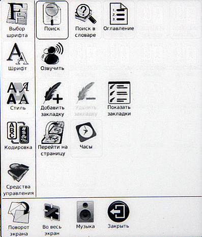 Озвучить - теоретически должен зачитывать текст с экрана. Практически мне это дело заставить работать не удалось. При вызове этого пункта снизу появляется вот такая менюшка и больше ничего не происходит. Один раз ридер при вызове этого пункта что-то квакнул по-китайски. Хотя текст был русский.
