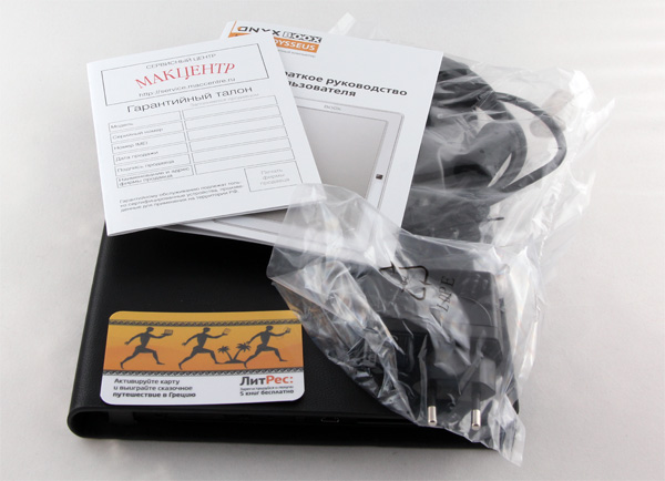 Само устройство, обложка, подарочная карта "ЛитРес", сетевой адаптер, кабель USB-miniUSB.