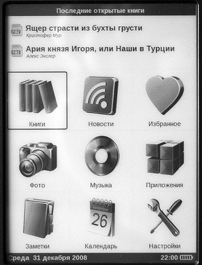 Главное меню - традиционное для Pocketbook: две последние книги и пиктограммы - книги, новости, избранное, фото, музыка, приложения, заметки, календарь, настройки.