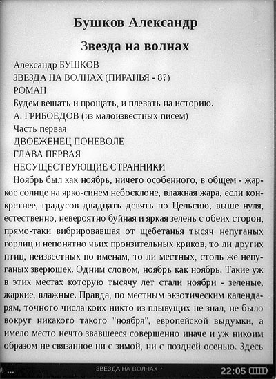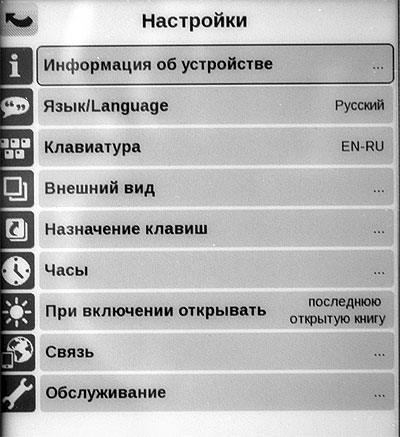 И очень жаль, что в настройках не обнаружилось пункта, который бы задавал поведение ридера при неактивности (энергосбережение). Потому что ридер автоматически вырубается буквально через пять минут неактивности, и сделать с этим ничего нельзя - по крайней мере, в данной прошивке, а ведь я специально скачал с сайта и залил самую последнюю прошивку.