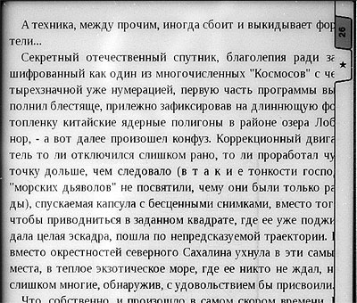 Боковые клавиши листания страниц в списке работают своеобразно: кнопка "Следующая страница" работает как Enter, то есть или входит в папку, или открывает файл, а кнопка "Предыдущая страница" работает как Home, то есть выводит на предыдущий уровень. Причем так работают правые кнопки листания. На левые в списке ридер вообще никак не реагирует. А зря, сделали бы перемещение курсора вверх-вниз - это было бы очень удобно.