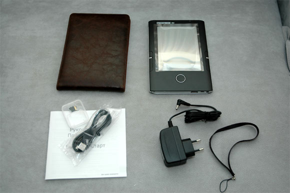 В комплект, кроме непосредственно ридера, входят: кожаная обложка, зарядное устройство, кабель USB-miniUSB, microSD-карта в 4 Гб, инструкция, петелька для переноски.