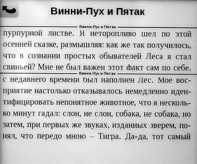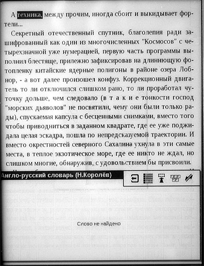 Сначала о листании страниц. Вы можете их листать клавишами слева-справа - это, в общем-то, удобно. Так же, как и в Sony Reader, страницы можно листать жестом справа-налево или слева-направо в нижней части экрана - пальцем или стилом. Жесты снизу вверх приводят к увеличению шрифта, жесты сверху вниз - к уменьшению.
