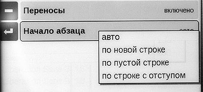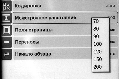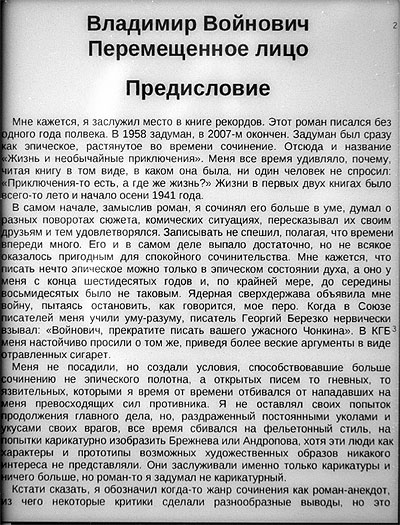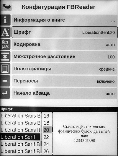 Текст книги конфигурируется в достаточно широких пределах. Кроме шрифта и кегля можно также настраивать кодировку, межстрочное расстояние, поля, переносы и начало абзаца.