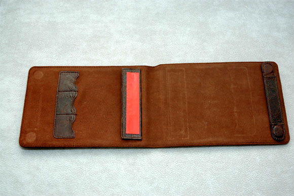 Обложка из настоящей кожи, выглядит "богато", однако ее функциональность под большим сомнением: я не знаю, кто придумал делать ее раскладывающейся по вертикали, а не по горизонтали.