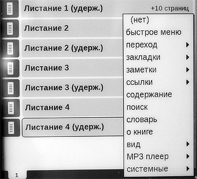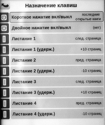 И там оказалось, что на кнопку питания и клавиши листания можно навесить широкий спектр самых разнообразных действий - например, на листания с удерживанием. Жалко только, что это все относится только к чтению текста, а не к просмотру списка папок-файлов. Ну и что действия ядерной кнопки Home никак нельзя переопределять.