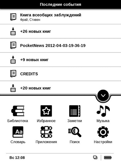 Основная страница включенного ридера выглядит следующим образом. Сверху - последние события: читаемые книги, закачанные книги. Под ними - пиктограммы меню: библиотека, избранное, заметки, музыка, словарь, приложения, поиск, настройки.