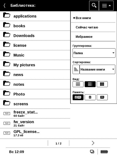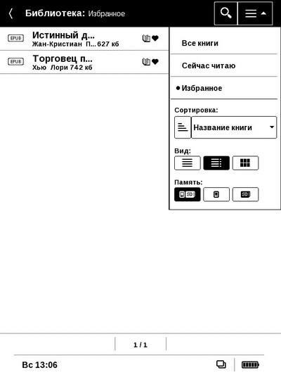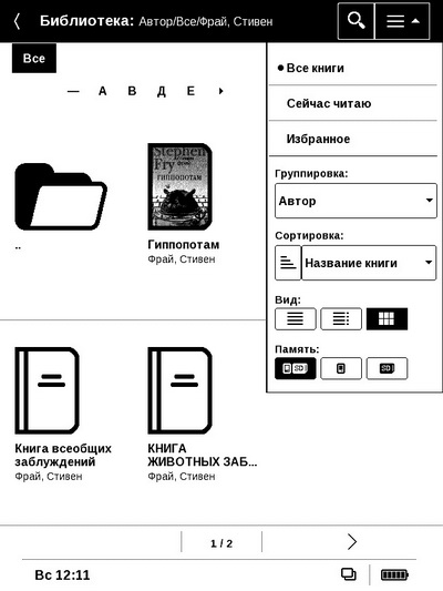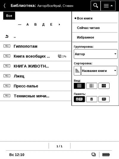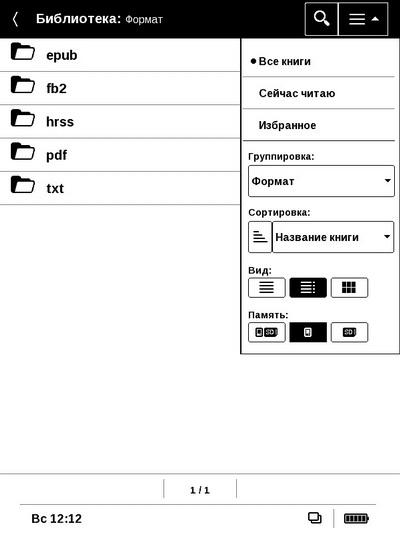 Открываем пункт "Библиотека". Слева идет список файлов-папок (или просто книг, в зависимости от группировки), справа - фильтры, группировка, сортировка, вид и память (встроенная и SD, только встроенная, только SD).