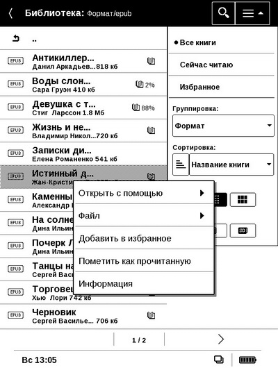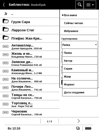 Самый интересный пункт - "Группировка". Вы можете отбирать книги по папкам (это как в старых PocketBook), авторам, сериям, жанрам, форматам и дате создания. Это просто отлично - предусмотрены практически любые варианты, с таким отбором на ридере можно держать здоровенную библиотеку и очень быстро находить требуемое.