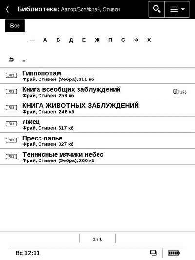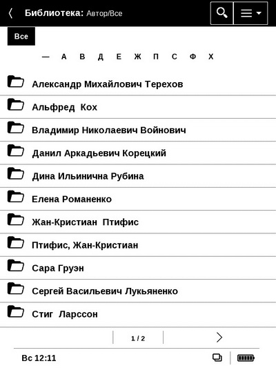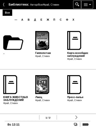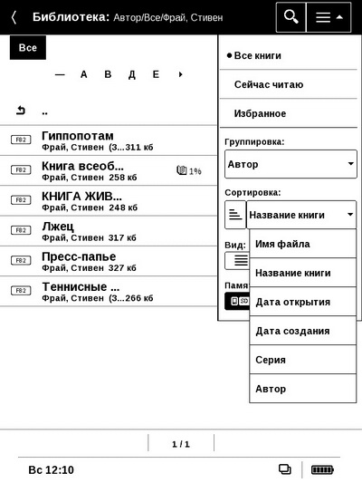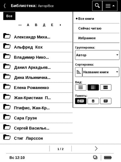 Лично я обычно предпочитаю раскладывать книги по папкам, однако отбор по авторам тоже довольно удобен, раз ридер сам умеет делать подобную группировку. А он умеет! Одна там только серьезная проблема в таком отборе - сортирует по именам, а не по фамилиям.
