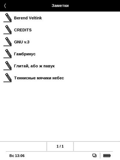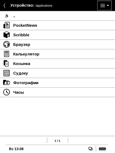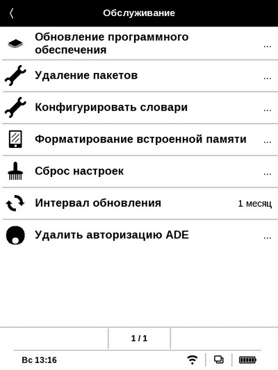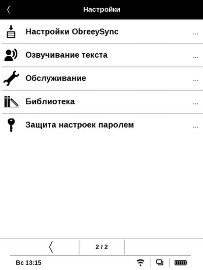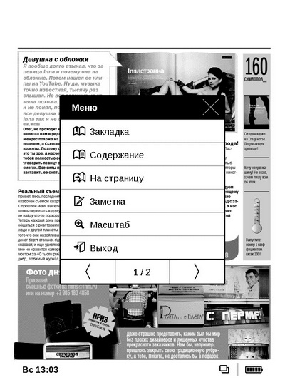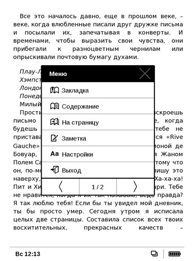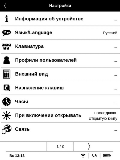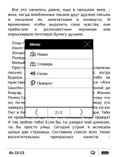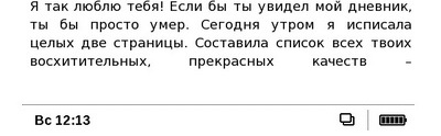 Строка состояния снизу может быть в двух вариантах: номер страницы, количество страниц и стрелка переключения строки или день недели, время, вызов меню (главное меню, настройки, читаемая книга, библиотека), уровень заряда аккумулятора.