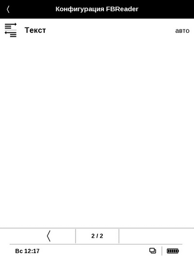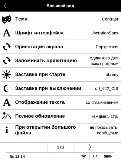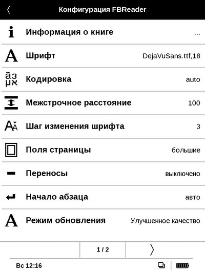 Настройки - настройки текста: шрифт, кодировка, расстояние между строк, шаг изменения шрифта, поля, переносы, начало абзаца, режим обновления.