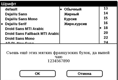 Открыл книгу формата EPUB. Там все то же самое, однако оказалось, что ридер как-то странно интерпретирует задаваемый размер шрифта. Такое ощущение, что он 10-й кегль принимает за 16-й, ну и с остальными кеглями творится то же самое.