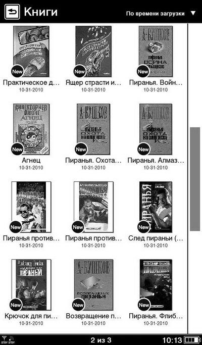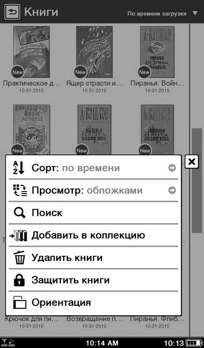 Там интереснее всего режим отображения книг. По умолчанию выводятся обложки. Вы можете также задать режим списка и только название. Второй режим отличается от первого тем, что там не указывается дата файла и название может выводиться в две строки.
