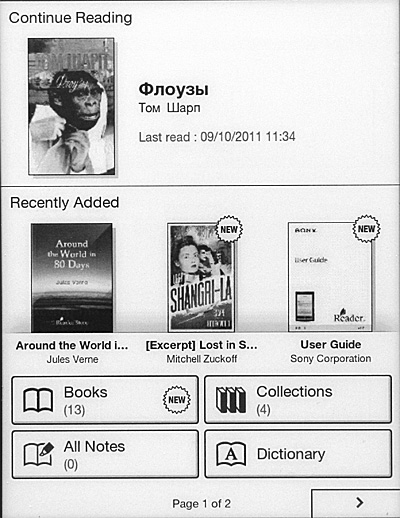 Главная страница ридера выглядит следующим образом. Сверху - текущее читаемое издание, ниже - три последних закачанных издания, под ними - четыре крупные кнопки: библиотека, все заметки, коллекции, словарь.