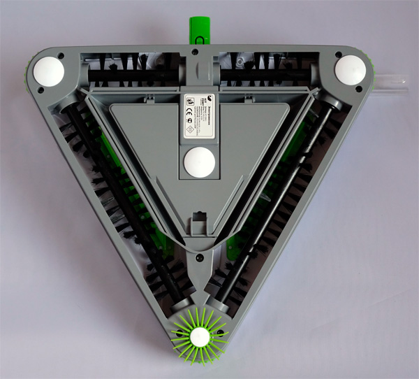 Нижняя поверхность электровеника: три вращающиеся щетки плюс четвертая круглая щетка - для уборки в углах и труднодоступных местах.