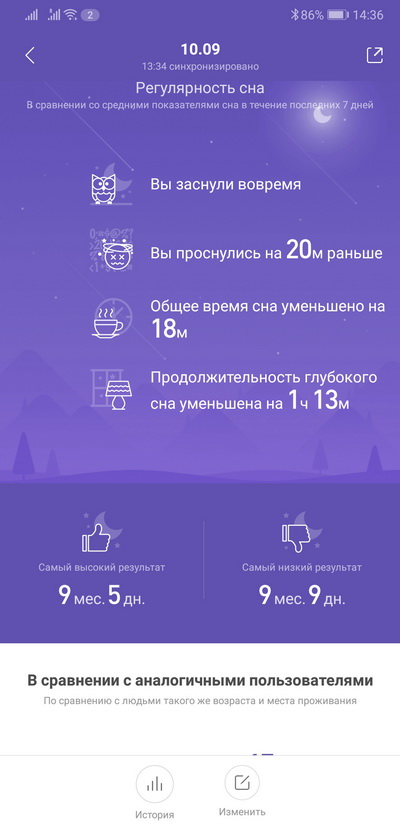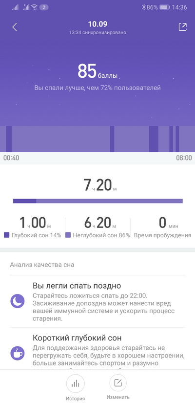 Подробная статистика по сну. И как же приятно видеть, что я спал лучше, чем 72% пользователей.