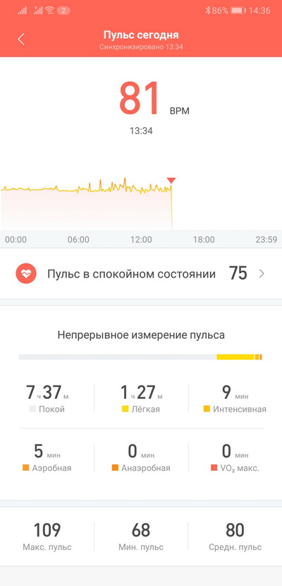 Пульс: при нажатии кнопки измеряется текущий пульс. Постоянно отслеживать пульс устройство тоже умеет, но это включается в приложении.