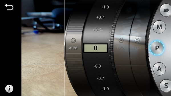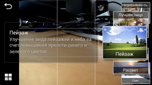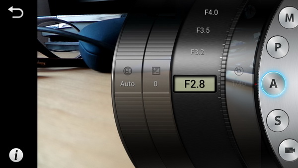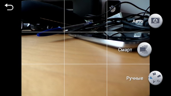 Правой круглой экранной кнопкой выбирается режим: автоматический, смарт (это аналог scene у обычных аппаратов) и всякие ручные: программный авто (P), приоритет диафрагмы (A), приоритет выдержки (S), полностью ручной (M).