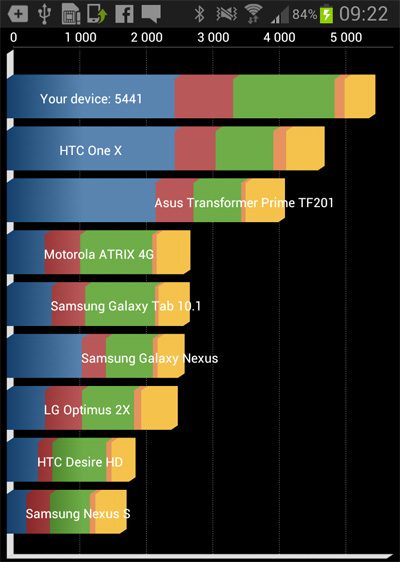 Погонял тесты на быстродействие. Quadrant Standard выдал ему 5441. Кстати, негусто, у Galaxy S 4 - 12080.