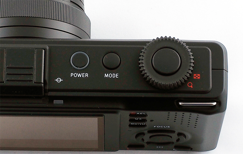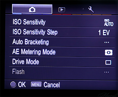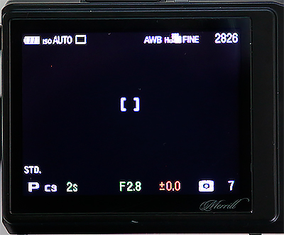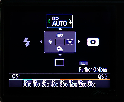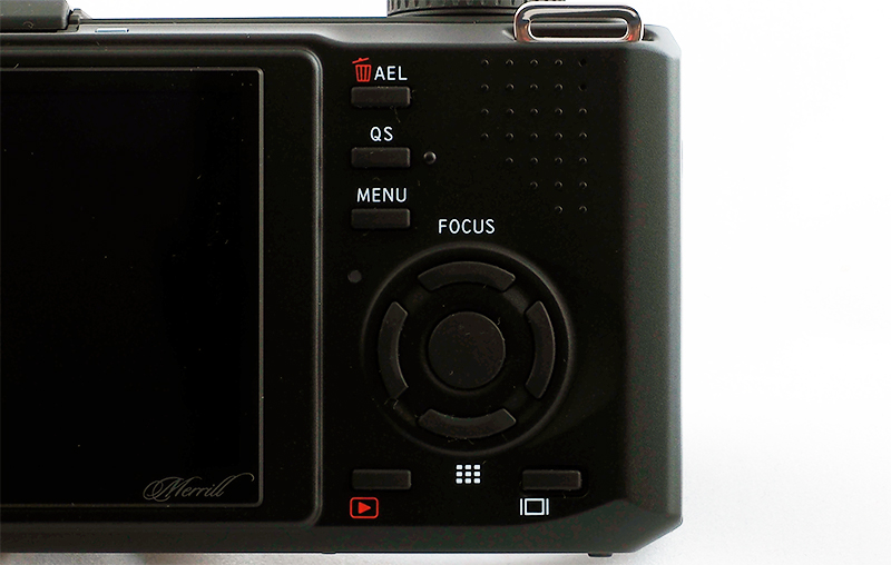 На заднем торце следующие управляющие клавиши. AEL - блокировка экспозиции. QS - быстрые настройки: ISO, вспышка (видимо, для внешней), вид оценки экспозиции, вид съемки (одиночная, серия, таймер). Menu - меню настроек, которые тут очень примитивные (для съемки, собственно, почти все настройки вызываются через QS). Пятипозиционное кольцо снизу в основном управляет точками фокусировки, но может переключать определенные настройки и виды просмотра снятых изображений. В самом низу - кнопка просмотра сделанных кадров и кнопка, меняющая вид информации на экране.