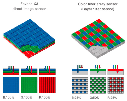 В данной же камере установлена матрица Foveon X3, разработанная американской компанией Foveon. Главное ее отличие заключается в том, что этот сенсор регистрирует все три цветовые составляющие (RGB - красный, зеленый, синий) в одном пикселе - благодаря трем слоям. И никакие мозаичные фильтры, ухудшающие изображение, здесь не используются. Таким образом, фотография, сделанная на эту матрицу, несет в три раза больше информации, чем фотография, сделанная на обычную матрицу.