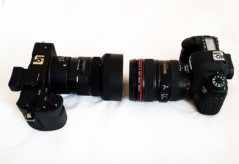 Ну и в сравнении с зекальной полнокадровой камерой Canon EOS 6D, причем он не с фиксированным объективом, а с зумом 24-105. С фиксом он становится почти в два раза короче.