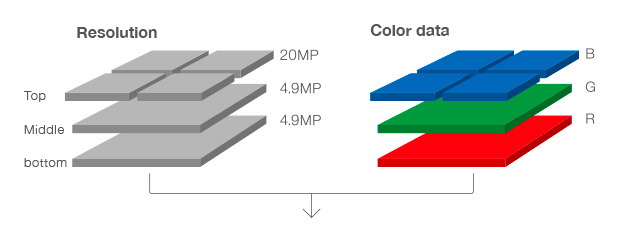 Как видите, верхний слой - 20 Мпикс, два других - по 4,9 Мпикс. Компания Sigma называет Foveon X3 Quattro 30-мегапиксельным: 20 + 4,9 + 4,9. Но экспертное сообщество считает, что это 20-мегапиксельный сенсор - по максимальному количеству элементов на одном из слоев. В данной камере используется матрица с немного другими характеристиками (точные данные я найти не смог), и компания утверждает, что здесь 39 Мпикс. Но получаемый размер кадра - 5424×3616 - скорее говорит о том, что здесь 20 Мпикс, а никак не 39.