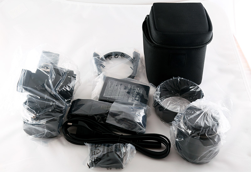 Комплект поставки: камера, наплечный ремень, крэдл для зарядки аккумулятора, аккумулятор, кабель сопряжения с ПК, чехол для объектива, объектив, бленда.
