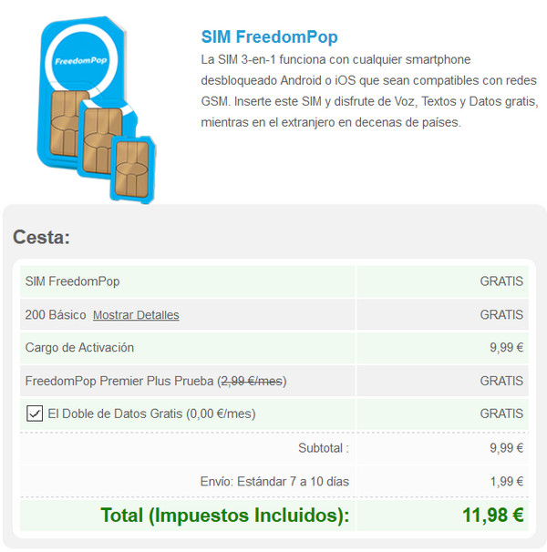 Карточка nanoSIM с двумя переходниками под microSIM и miniSIM. В смартфоне она настраивается более или менее просто: нужно включить режим данных и данных в роуминге, в APN прописать freedompop.foggmobile.com.