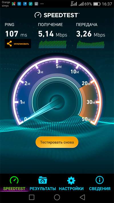 Интернет заработал сразу и показал, в общем, вполне обычную для большинства операторов в этом районе скорость. (До 20-50 Мб тут добивает только Vodafone.)