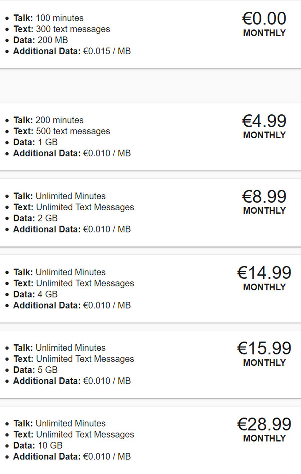 При заказе предлагает такие варианты: бесплатный план (понятно, что с большими ограничениями, но Интернета типа как обещают 400 МБ), €16 в месяц за 10 ГБ и неограниченные звонки/SMS), также предлагается вариант за €9 в месяц с 4 ГБ данных, но первый месяц будет бесплатный.